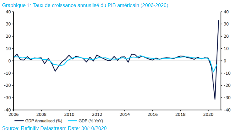 Le dollar a reçu un coup de pouce supplémentaire après les chiffres impressionnants du PIB américain d’hier. L’économie américaine a progressé à un taux annualisé de 33,1% au 3ème trimestre, l’activité ayant repris vie après la contraction record enregistrée au deuxième trimestre. Les investisseurs ont toutefois largement négligé la bonne surprise étant donné le décalage des données. Comme nous l’avons vu en Europe, il reste la possibilité d’un ralentissement brutal de la croissance américaine au quatrième trimestre. Il ne semble pas que de nouvelles mesures de confinement soient prévues dans l’immédiat aux États-Unis. Néanmoins les cas de contamination sont en hausse et atteignent de nouveaux records, il ne faudra peut-être pas attendre longtemps pour que des mesures supplémentaires soient mises en place au niveau des états.